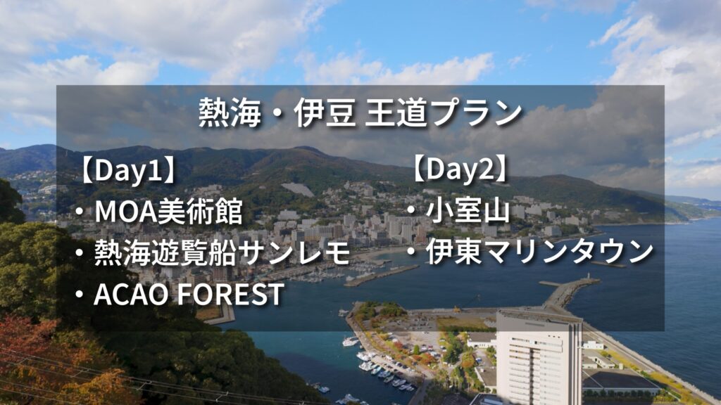 この熱海・伊豆王道プランは、「まずは伊豆を知りたい」という方にとって、安心感のある1泊2日モデルコース です。