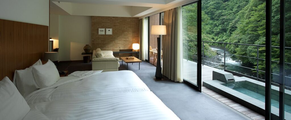全16室のスイートはすべて源泉掛け流し露天風呂付き。渓流に張り出すように設計されており、川面を流れる水音と、眼前の紅葉が溶け合う景色はまさに絵画のようです。