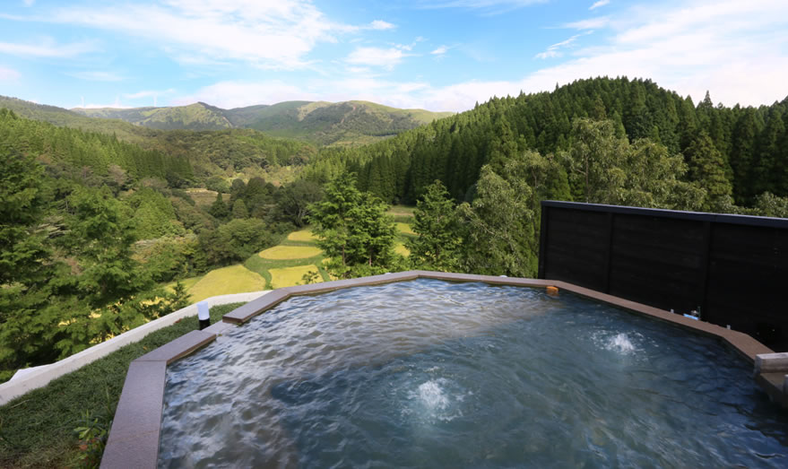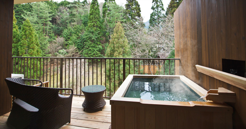 各棟には趣の異なる間取りと設えが施され、全室に源泉かけ流しの客室露天風呂を完備しています。