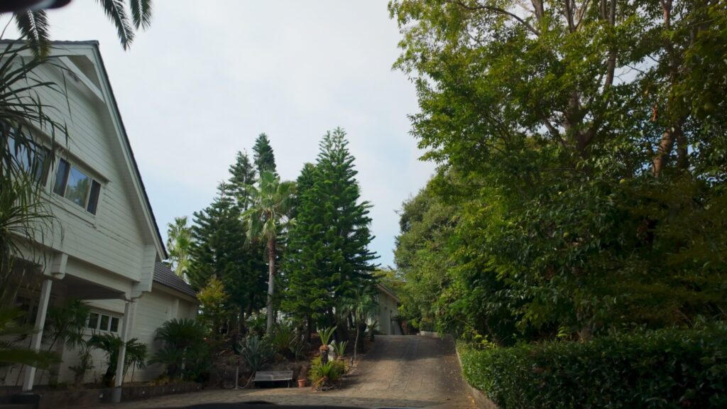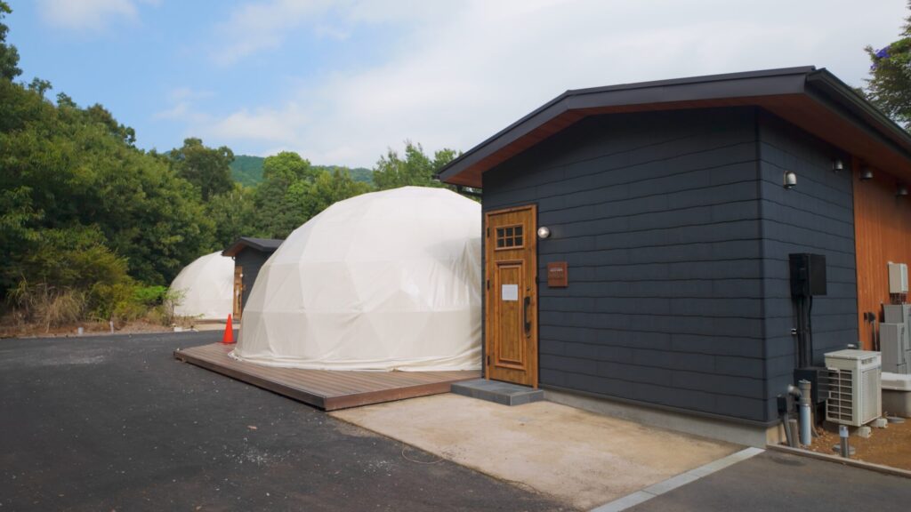 坂道の手前に3棟のヴィラ、さらに奥へ進むとグランピング施設が2棟並んでいます。