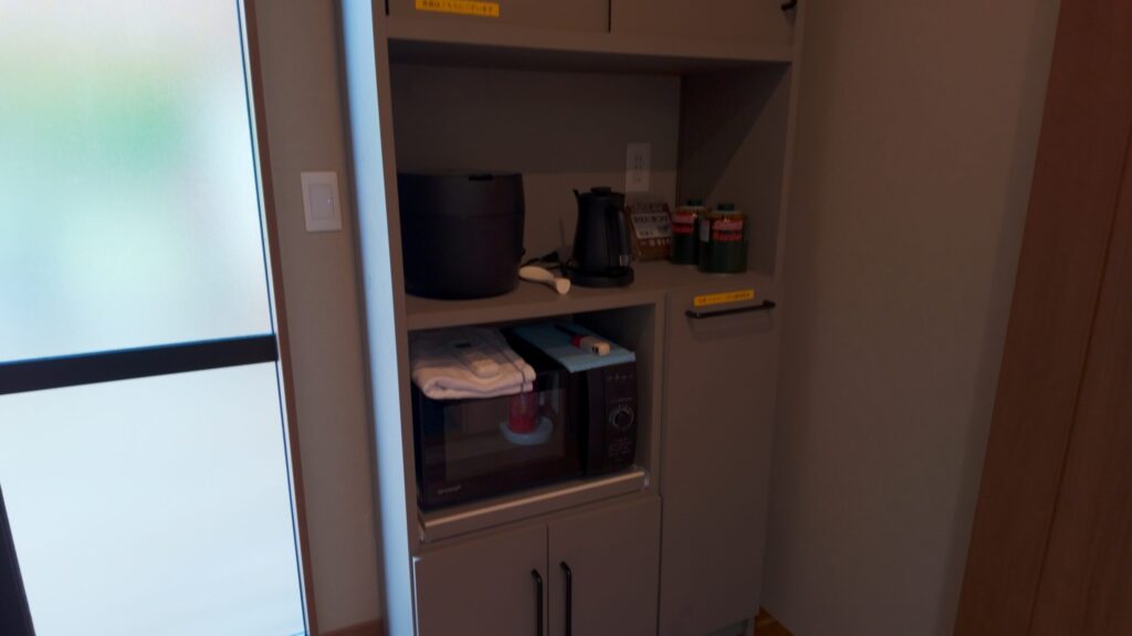 玄関を入ると、横には下駄箱。正面には炊飯器・電子ケトル・電子レンジなどの調理家電、割り箸やBBQ用トングが並んでいます。