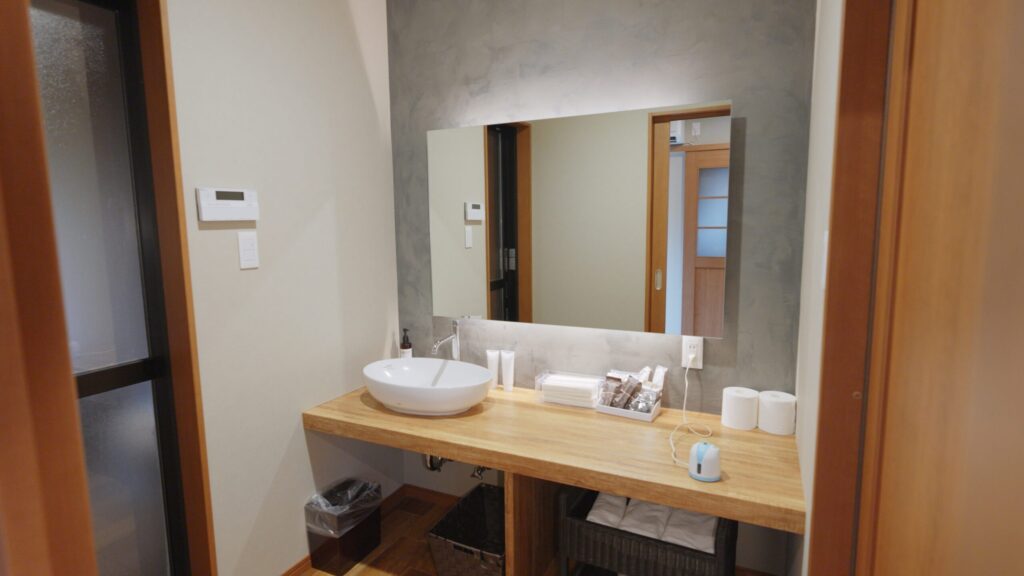 右手の扉を開けると、大きな鏡付きの洗面台。