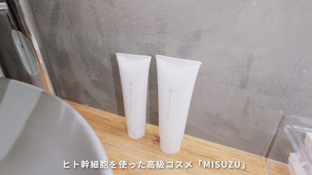 アメニティも充実していて、綿棒や歯ブラシに加え、ヒト幹細胞由来コスメ「MISUZU」のクレンジングや洗顔フォームまで。