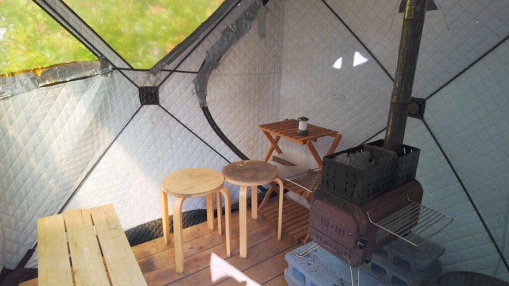 テントサウナの中は檜の香りが広がり、大人4人ほどが入れる広さです。