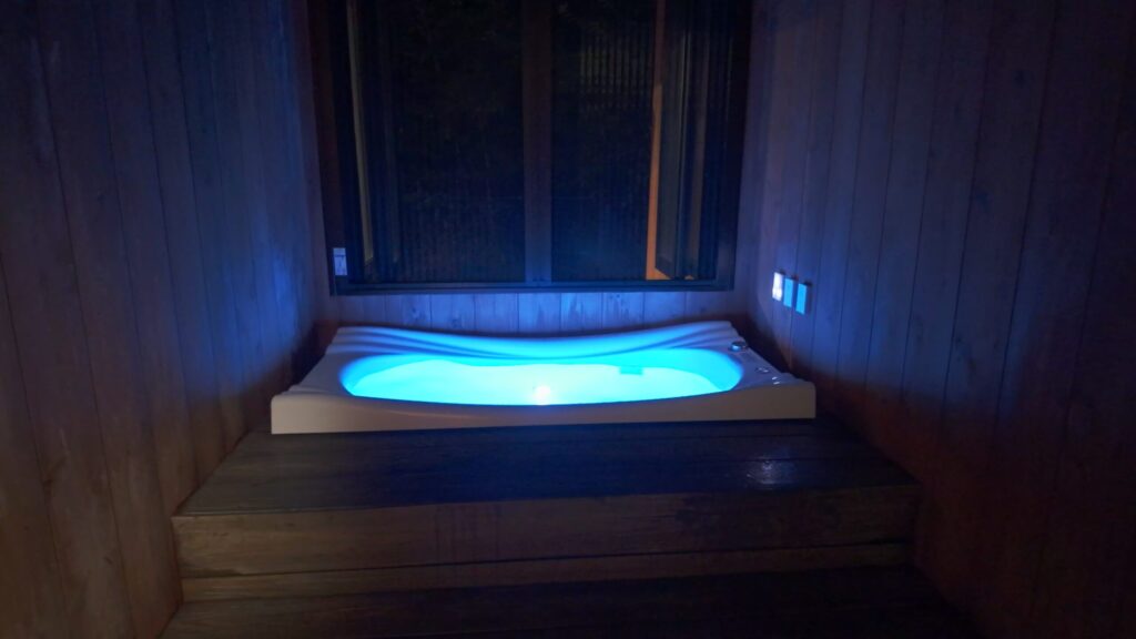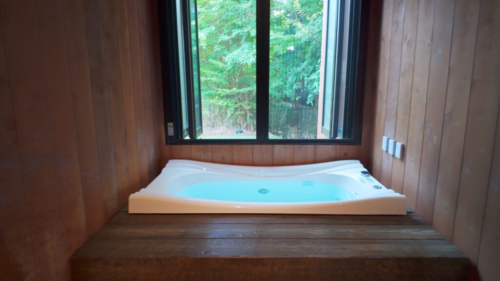 窓を開ければ半露天風呂のように楽しめ、ジャグジー機能やライティング演出も備わっています。