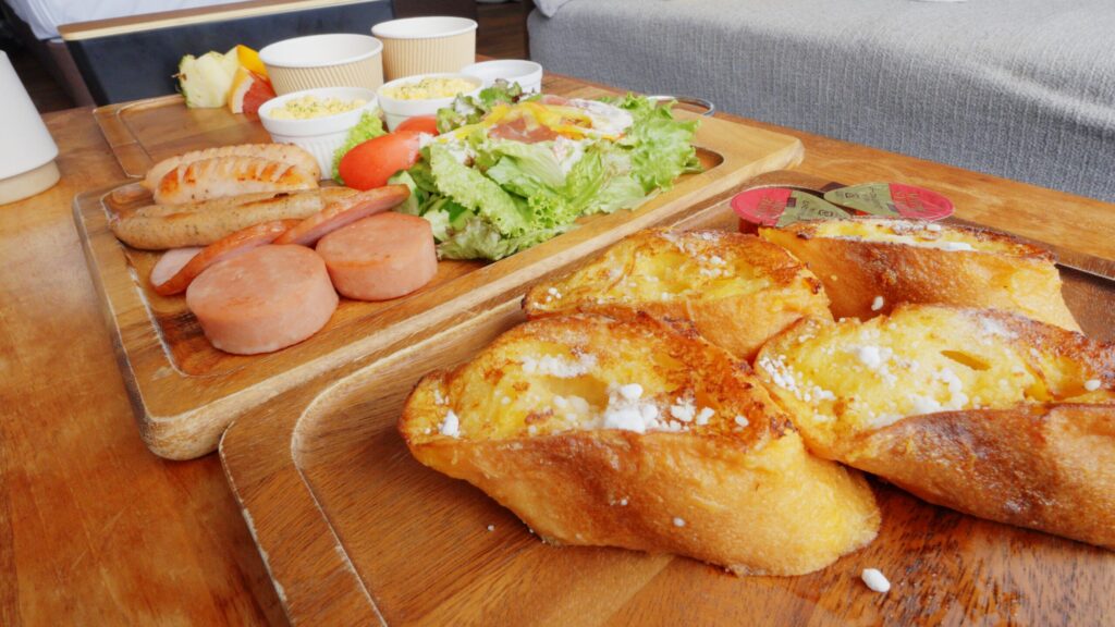 テーブルにはジューシーなハムやソーセージ、そして甘いフレンチトースト。見た目もボリュームも満点で、満足感のある内容でした。
