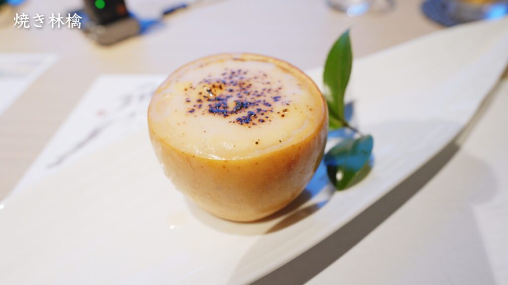 そして、この日一番驚いたのが「焼き林檎」。季節ごとにメニューは変わりますが、この焼き林檎だけは2018年から続く定番だそうです。丸ごとの林檎を使ったインパクト抜群の見た目もさることながら、中にはホタテとチーズを合わせた濃厚なクリームがたっぷり。食べ進めると林檎の優しい甘さが加わり、最後まで味の変化を楽しめます。