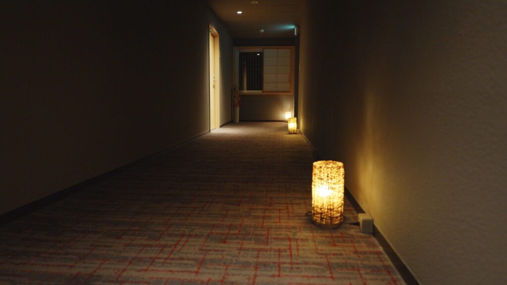 玄関はこじんまりとしつつも気品があり、優しい照明が温かく迎えてくれます。足を踏み入れた瞬間から、旅のスイッチが静かに入るような雰囲気です。