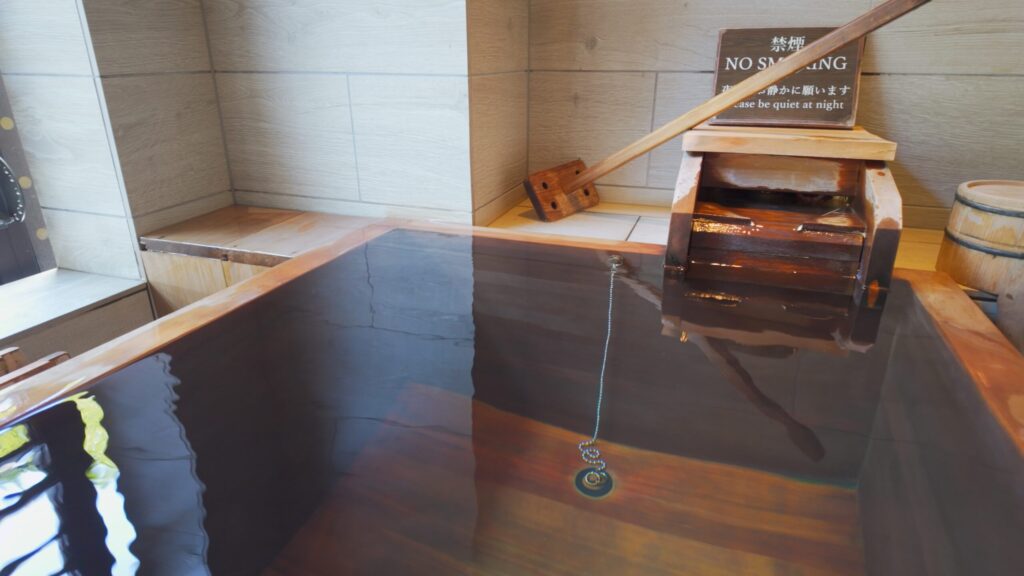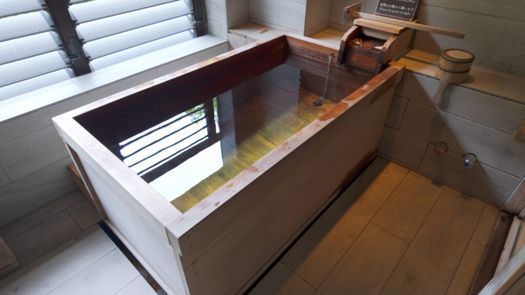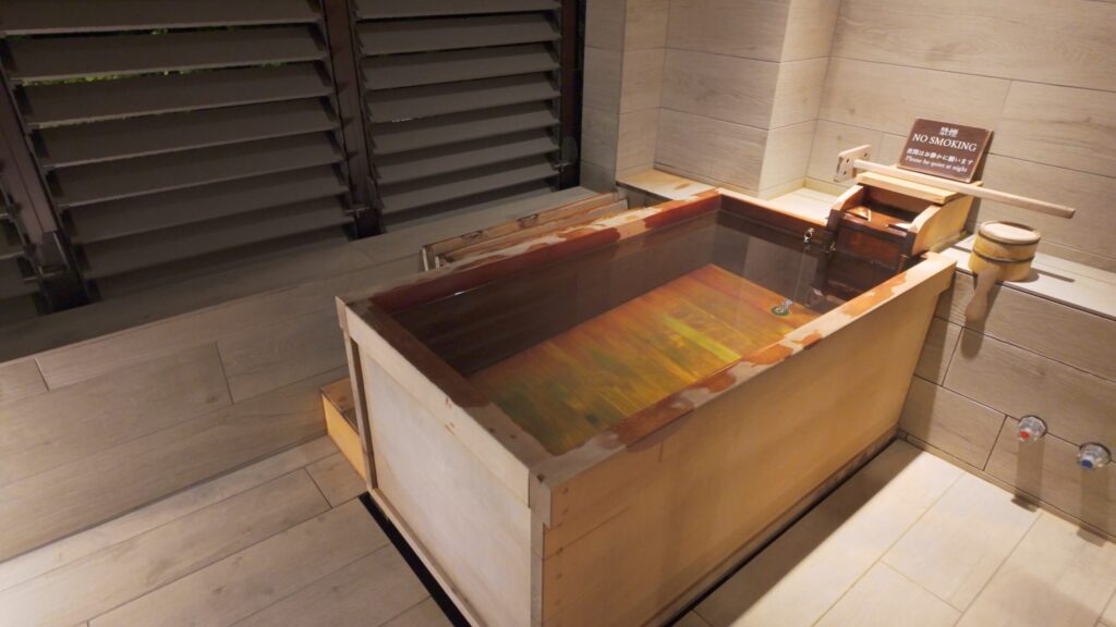 そして何より嬉しいのが、専用の半露天風呂。檜の浴槽に、大涌谷から引いた源泉かけ流しの温泉が満たされ、好きなときに好きなだけ浸かれる贅沢さは格別です。