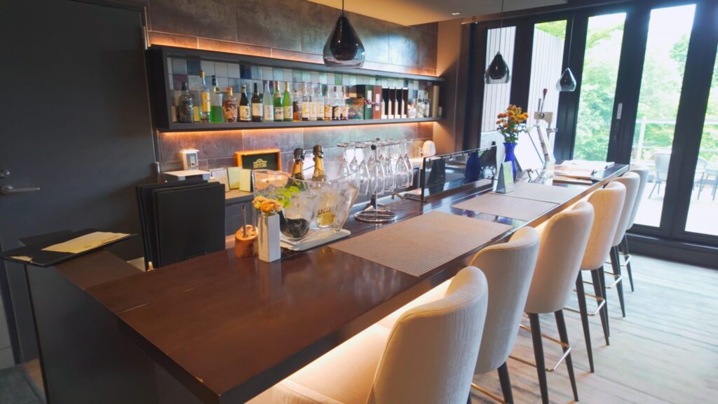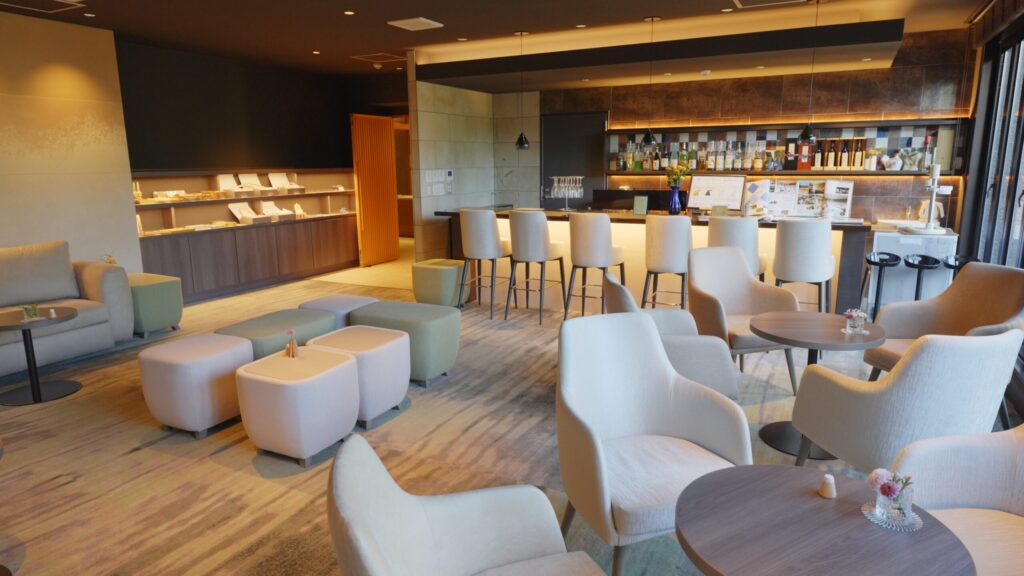 右手にはカフェ&バー「SORA」があり、こちらでチェックインを行います。室内は間接照明と落ち着いた色合いで統一され、シックで上品。奥には庭園とテラスがあり、晴れた日にはここでドリンクを楽しめば、箱根の自然と静けさを感じながら優雅なひとときを過ごせます。