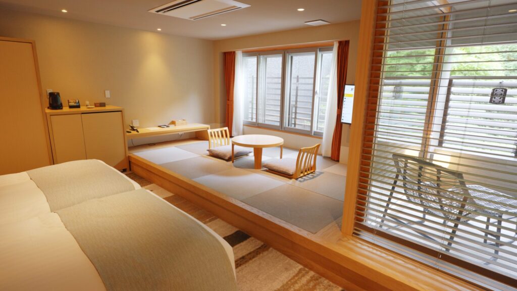 今回宿泊したのは、「森側‐和洋室‐」タイプのお部屋。名前は「だいだい」で、その名の通り室内は柔らかな橙色で統一され、とても上品で落ち着いた雰囲気です。畳スペースがあるのも嬉しいポイント。ホテルの洋室も好きですが、靴を脱いで畳に腰を下ろすと、やっぱりほっとしますよね。