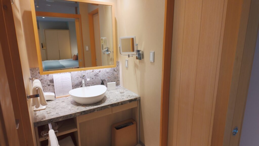 洗面台には大きな鏡があり、トイレは最新設備。アメニティも基本的なものは一通り揃っているので、手ぶらでも安心して滞在できます。部屋の随所に木の温もりが感じられ、自然と心が落ち着きます。