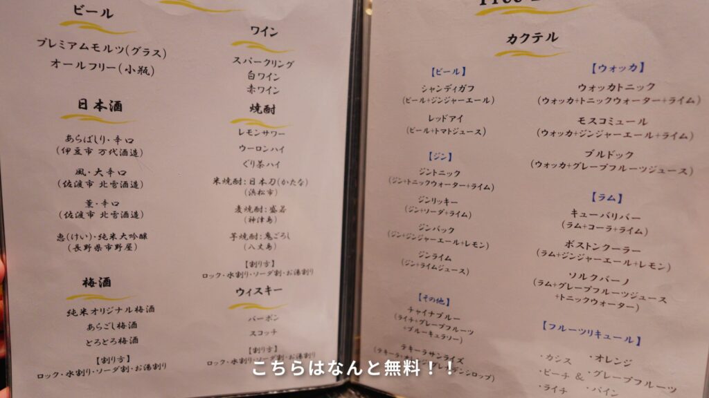 バータイムでは、アルコールやソフトドリンクを無料で楽しむことができます。