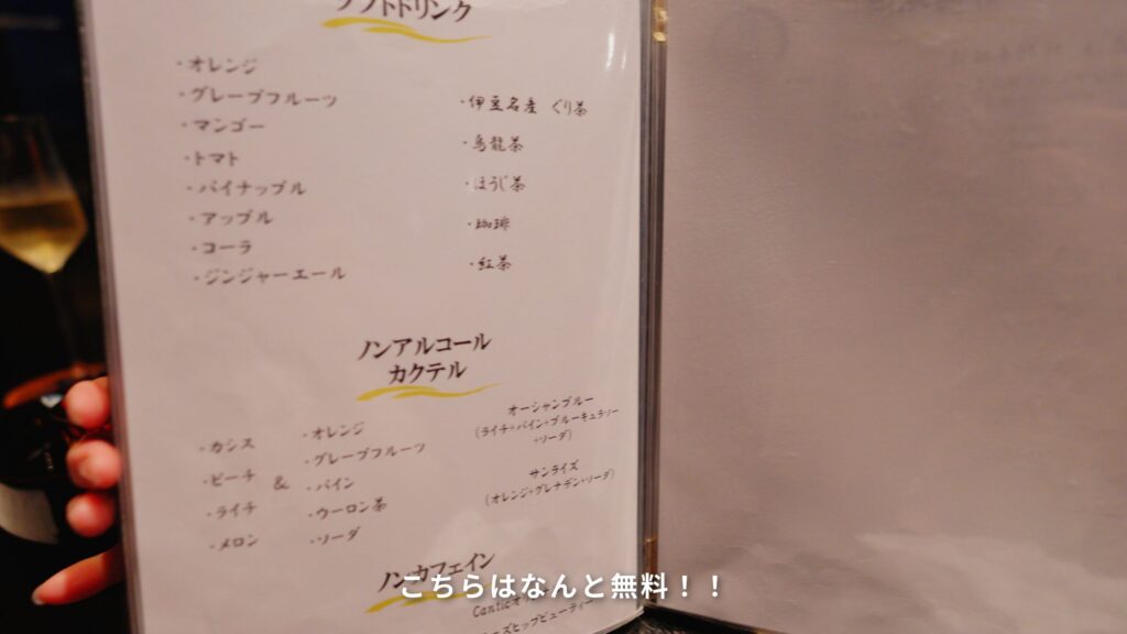 ドリンクはメニューから選ぶことができ、ソフトドリンクからアルコールまで幅広く用意されています。