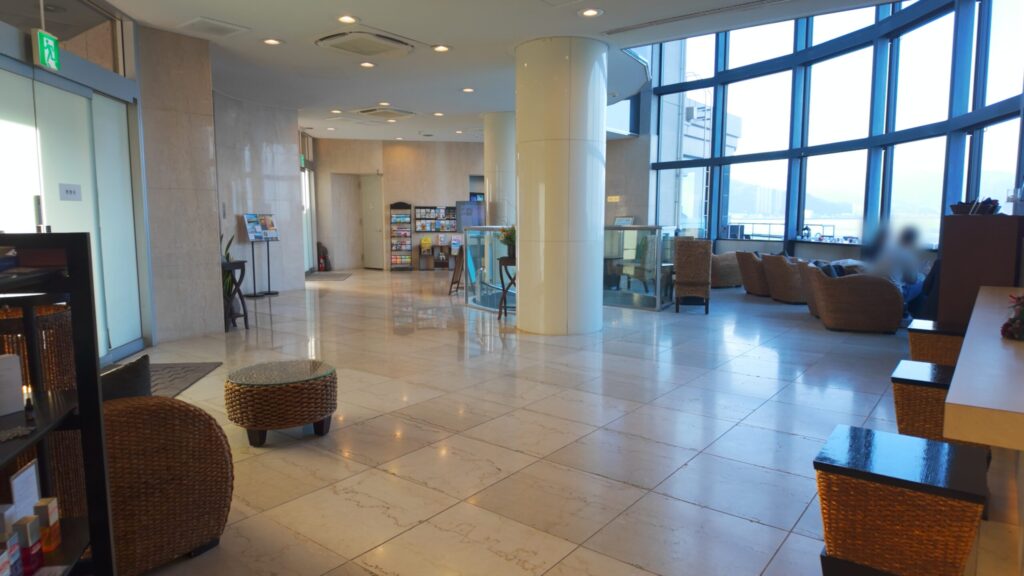 フロント自体はコンパクトな造りですが、屋上まで続く吹き抜け構造と全面ガラス張りの設計により、目の前には相模湾が広がります。