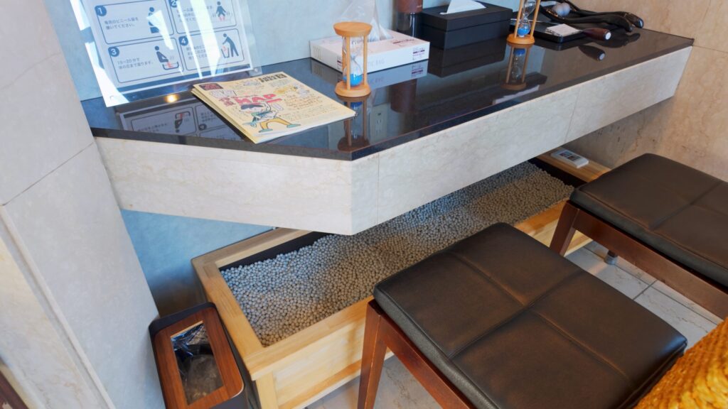 フロント横には、「濡れない足湯」と呼ばれる、セラミックボールを使った足湯があります。