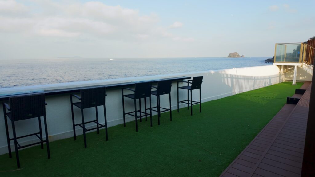 テラスからは海が間近に感じられ、迫力がありつつも、どこか落ち着いて過ごせる空間になっています。