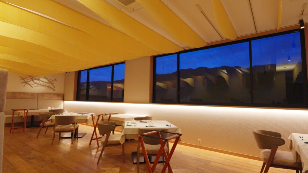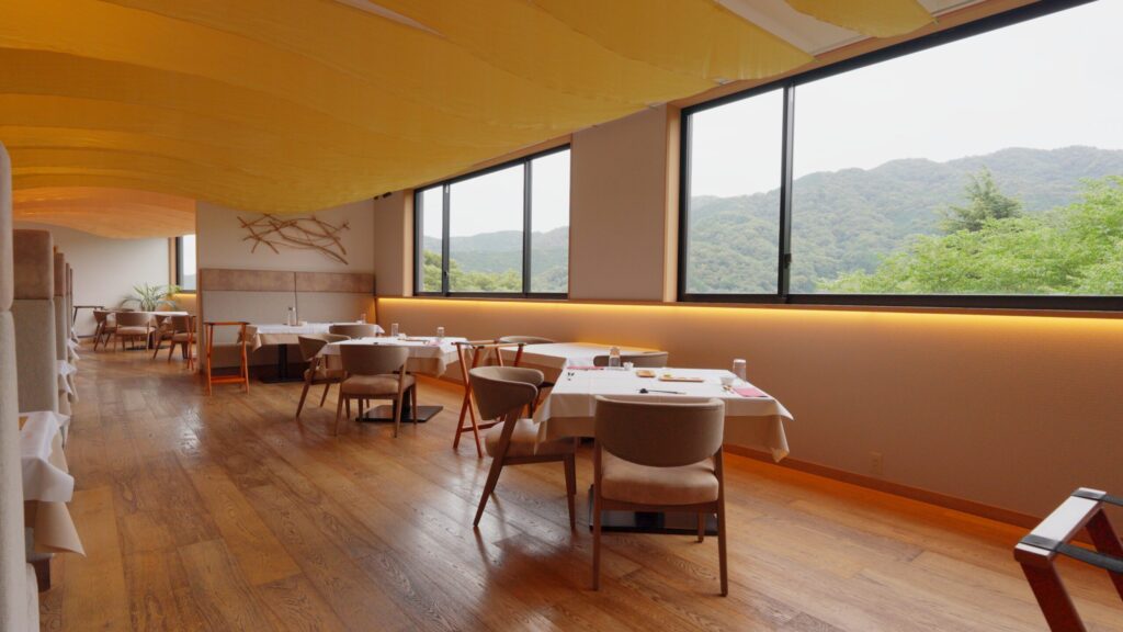 食事会場は広々としていて、窓からは山々を望むことができます。席の間隔もゆったりとしており、落ち着いた雰囲気で食事を楽しめます。