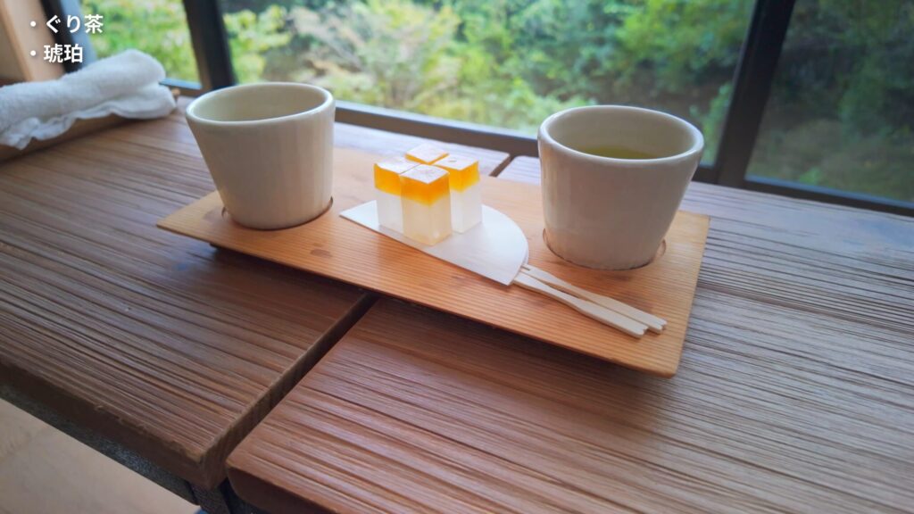 チェックイン時には、ぐり茶と和菓子「琥珀(こはく)」をいただきました。