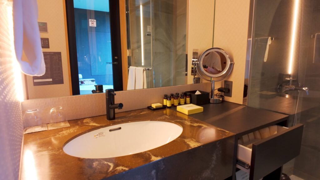 洗面台は広く使い勝手がよく、アメニティにもこだわりが感じられます。