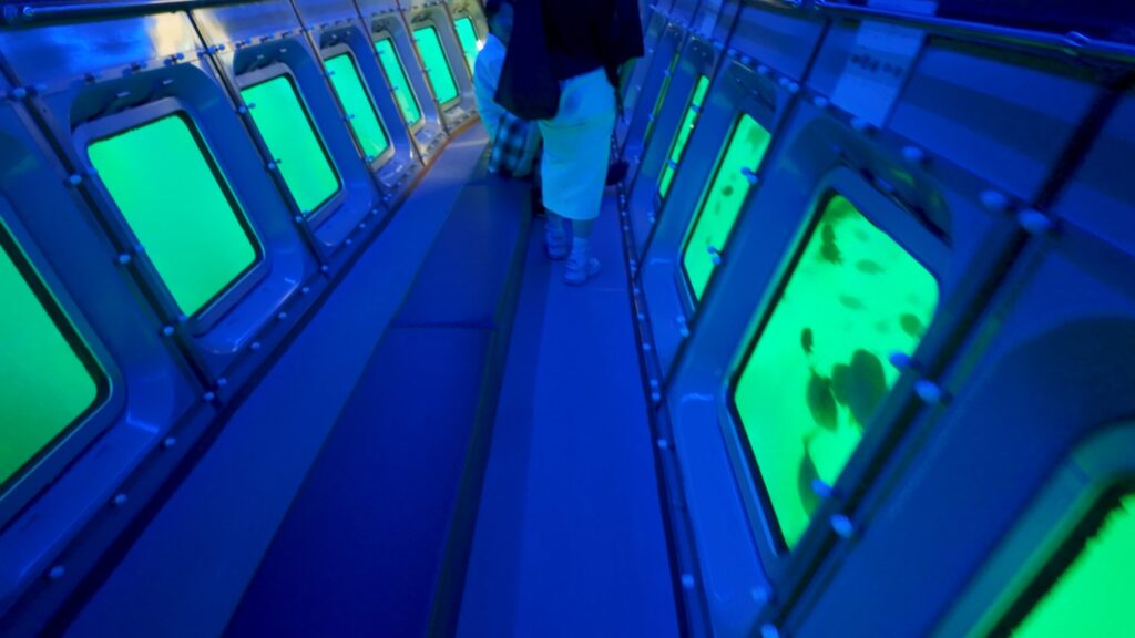 出港前には地下にあたる部分から海中の様子を見ることができます。まるで潜水艦の中です。狭いところが苦手な人は少し厳しい場所ですが…