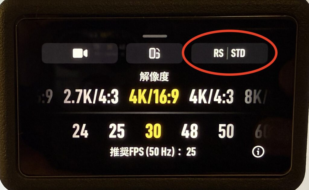 解像度やフレームレートを設定する画面が表示されたら、右上にある丸いアイコンをタッチしてください。