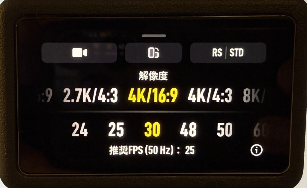 ここでは、上段を「4K / 16:9」、下段を「30fps」に設定します。