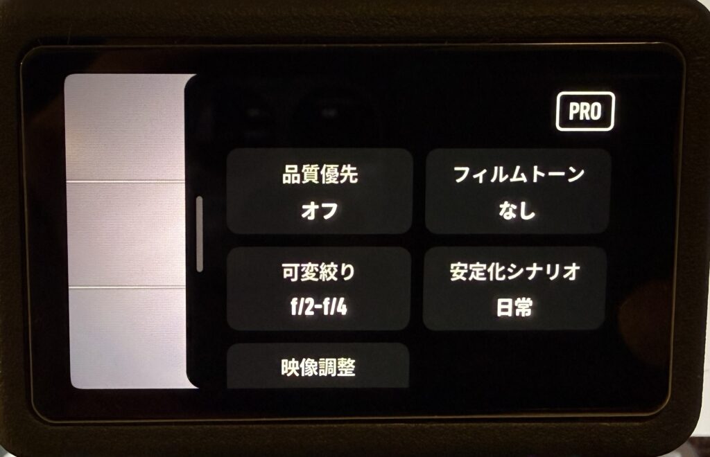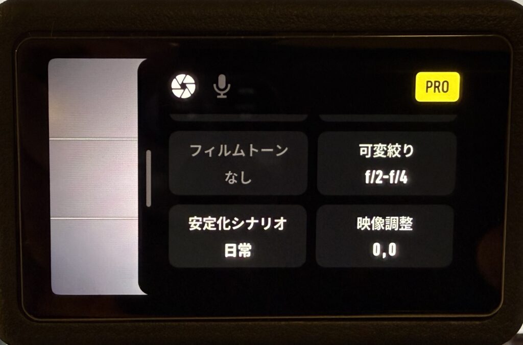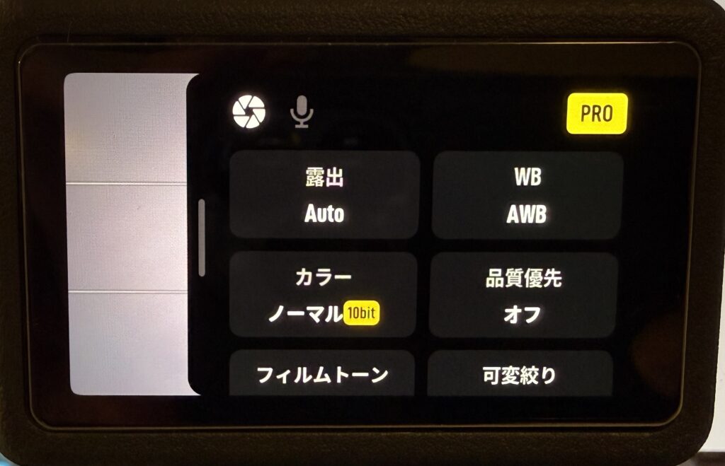 画面右上に表示される「PRO」の文字が白色の場合は、まだPROモードではありません。