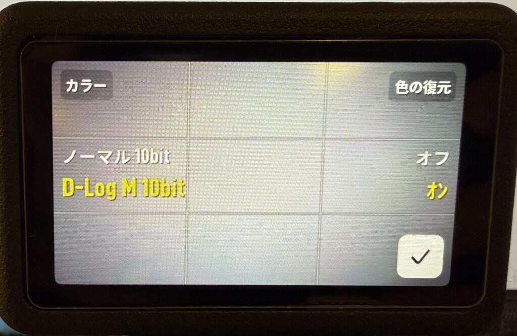 「カラー」の項目をタッチし、D-Log M 10bitを選択すれば設定完了です。