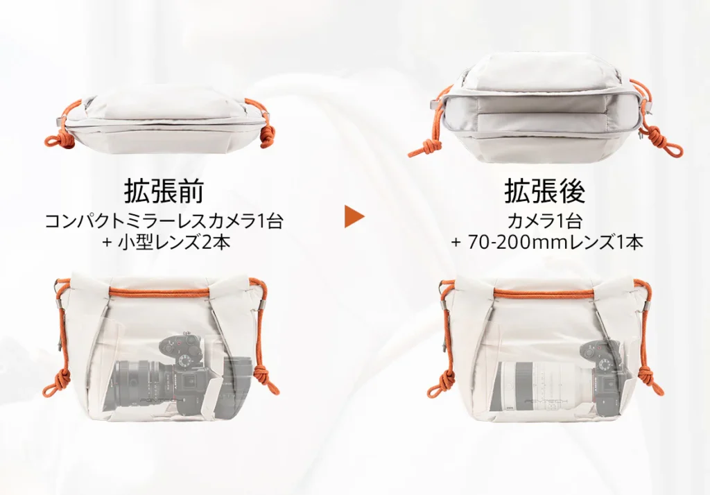 拡張前の状態でもカメラは収納できますが、拡張することで引っかかりもなく、スムーズに出し入れが可能になります。