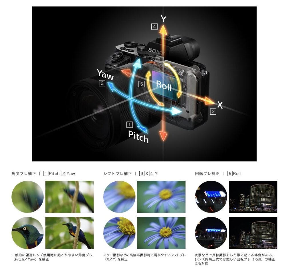 ただし、最近のsonyのレンズは軽量化のためにレンズ内補正を搭載しているものが少なく、ボディ内補正と電子補正が基本となります。