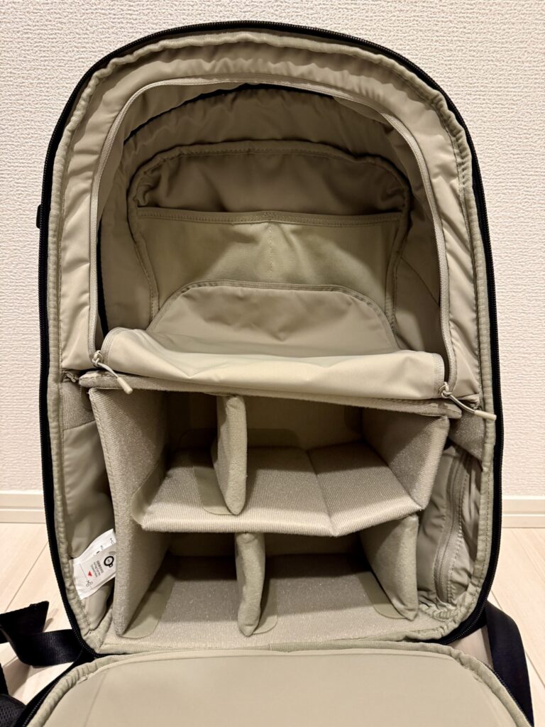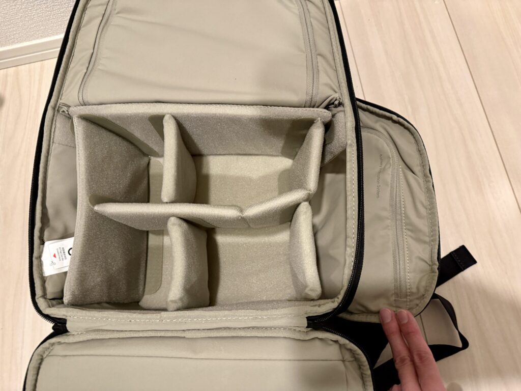 内部の仕切り(パーティション)もしっかりしていて、レンズや小物がきちんと固定されます。移動中にバッグの中で機材が動くことがなく、安心感があります。