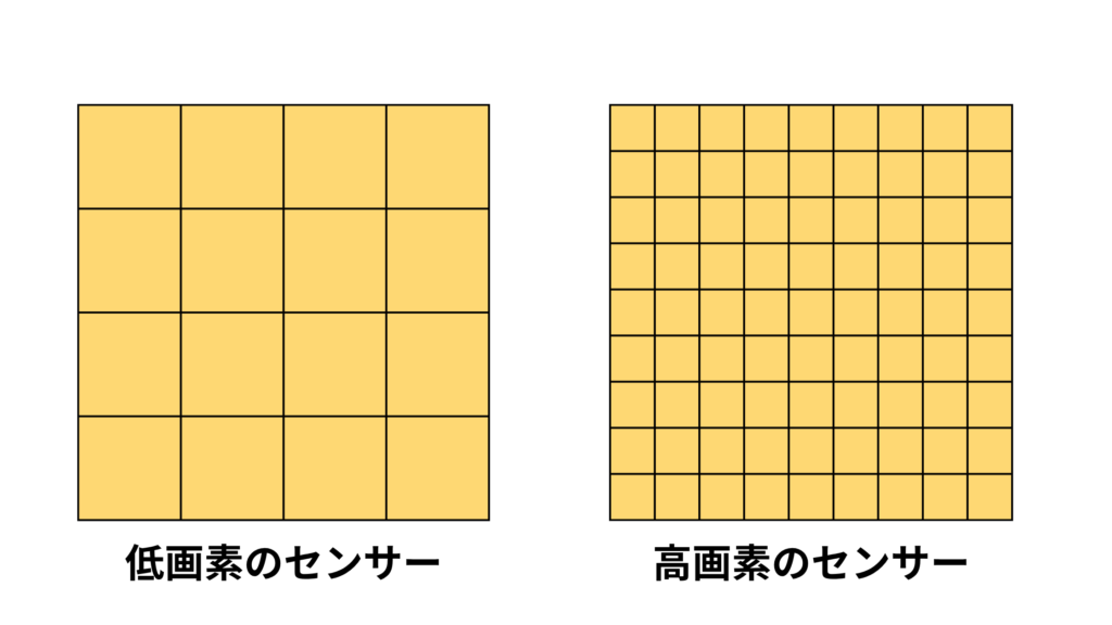 理由はシンプルで、同じフルサイズセンサーでも画素数が増えるほど「1画素あたりの光を受ける面積(=画素ピッチ)」が小さくなるからです。